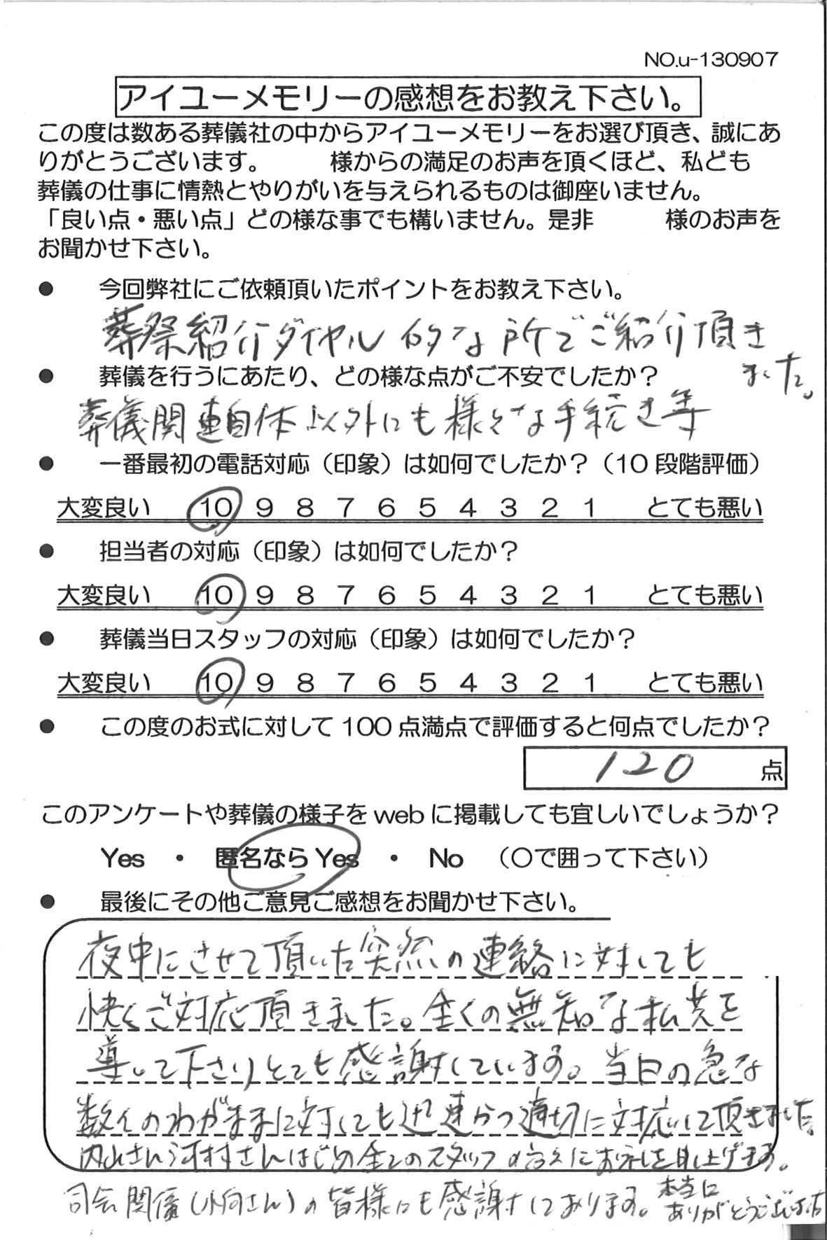 夜中にさせていただいた突然の連絡に対しても快くご対応いただきました。全くの無知な私共を導いて下さりとっても感謝しています。当日の急な数々のわがままに対しても迅速かつ適切に対応していただきました。内山さん河村さんはじめ全てのスタッフの方々にお礼を申し上げます。司会関係(小向さん)の皆様にも感謝しております。本当にありがとうございました。
