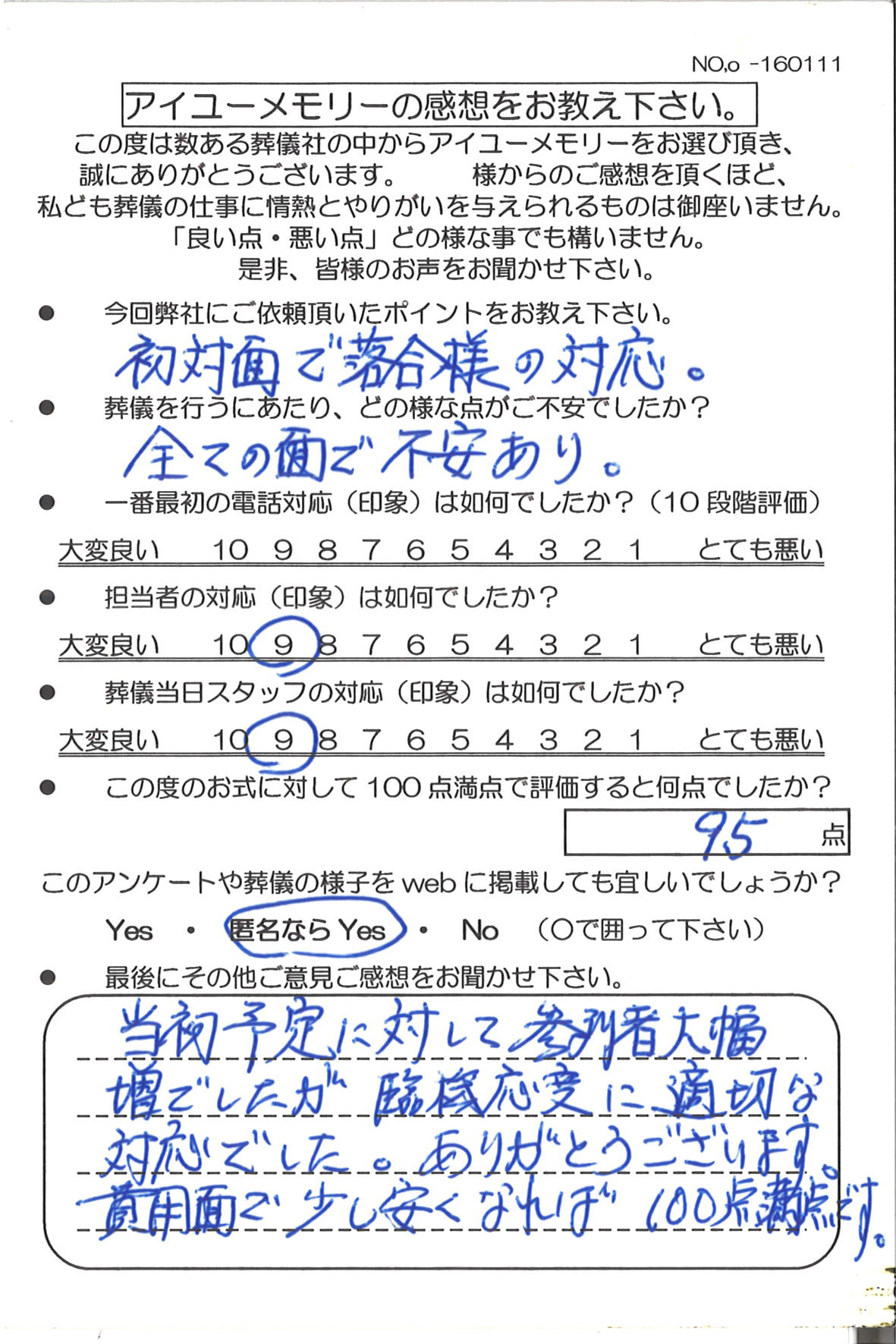 お客様の声22 iumemory | 2023年2月3日 | 更新日 2023年2月3日 当初予定に対して参列者大幅増でしたが臨機応変に適切な対応でした。ありがとうございます。 費用面で少し安くなれば100点満点です。